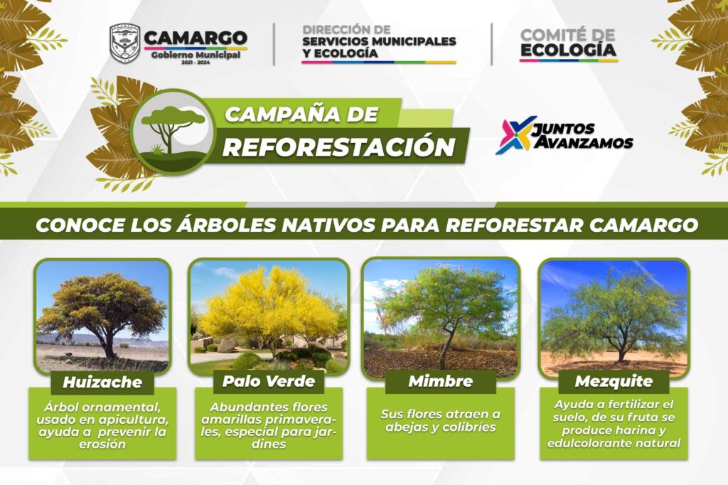El Gobierno Municipal de Camargo dió a conocer mediante el comité de ecología, una infografía para todas aquellas personas que quieran plantar un árbol de manera particular o en grupo, considerando algunas variedades nativas de la región. Lo anterior, con la finalidad de ahorrar agua y aportar una mejora al medio ambiente pues al plantar árboles nativos la fauna se ve beneficiada así como el propio ser humano.