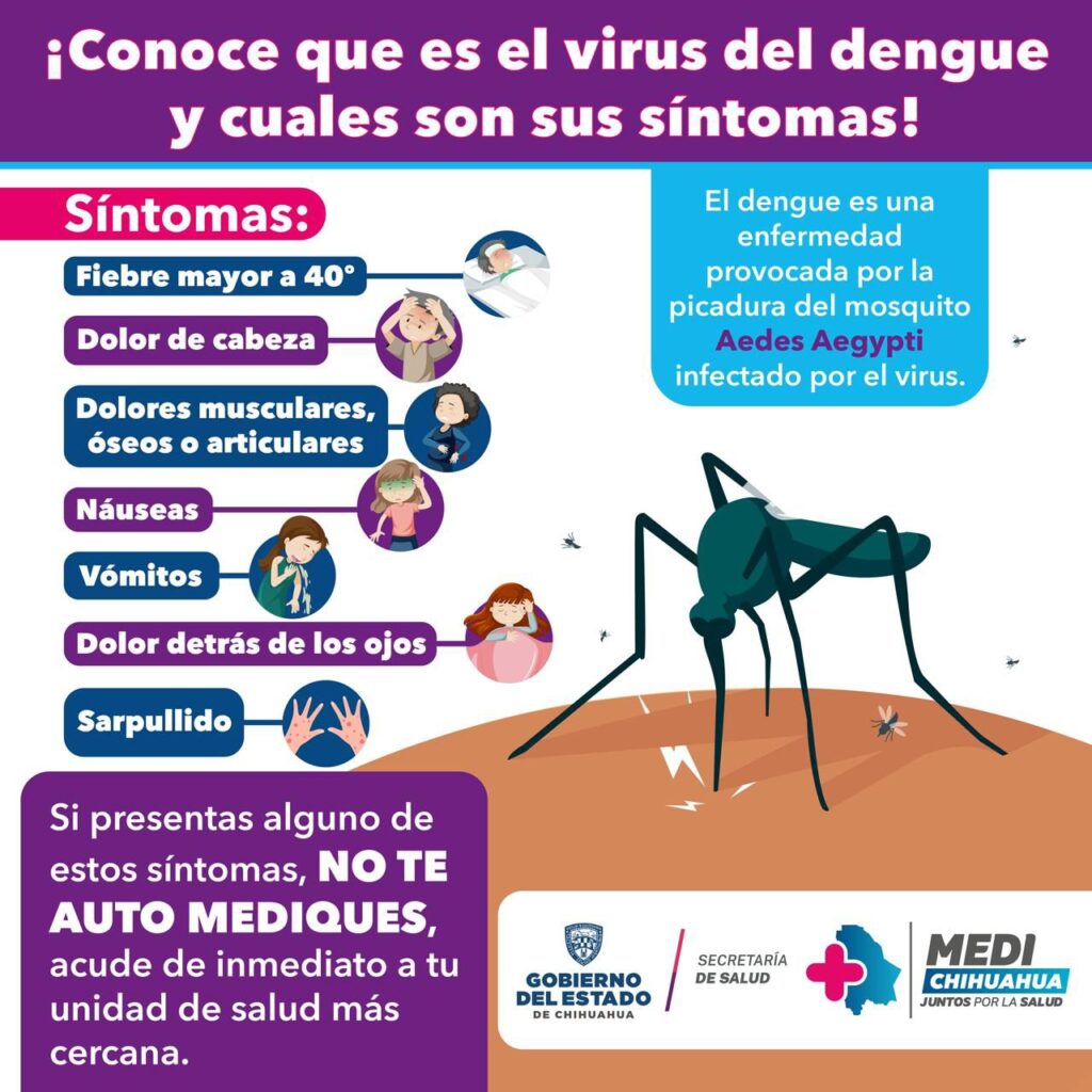 El dengue es una enfermedad grave que puede manifestarse con síntomas como fiebre mayor a 40 grados, dolor de cabeza intenso, dolores musculares, náuseas, vómitos, dolor detrás de los ojos y sarpullido. Si presentas alguno de estos síntomas, no te automediques y acude de inmediato a la unidad de salud más cercana para recibir atención médica.