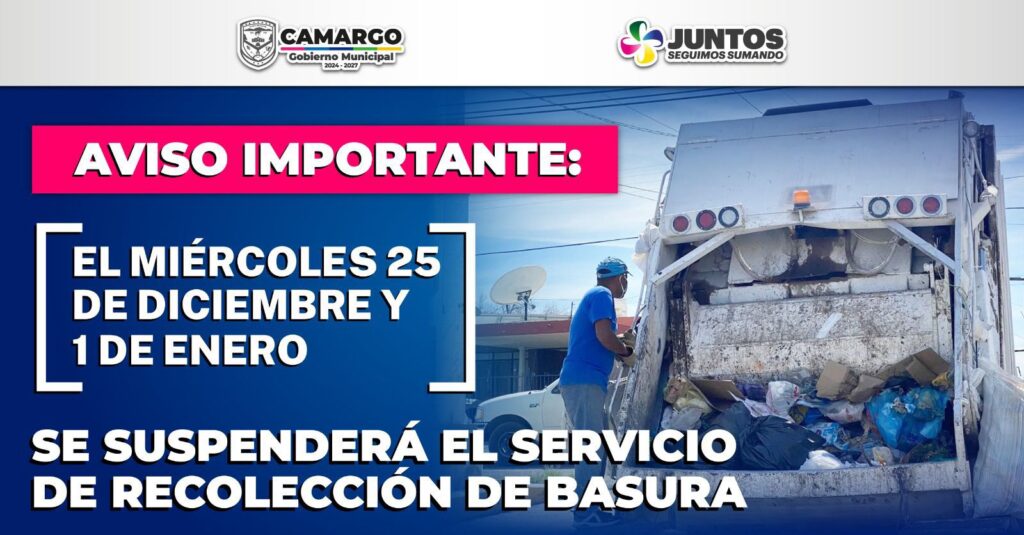 El Gobierno Municipal de Camargo, encabezado por el presidente municipal Jorge Aldana, informa a la población que el servicio de recolección de basura será suspendido en las siguientes fechas: