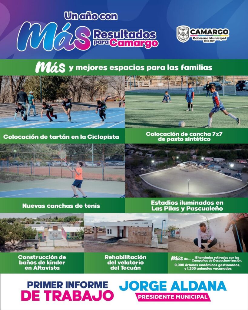 En el marco del primer informe de gobierno de su segunda administración, el presidente municipal de Camargo, Jorge Aldana, presentó los avances y resultados que se han logrado para mejorar la vida de las familias camarguenses, fortaleciendo espacios deportivos, educativos y de convivencia.